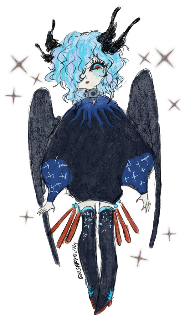She is my sona or character with which I represent myself. It's a spatial and aquatic creature, it has an angelic appearance but its species is unknown. She is introverted and shy, is androgynous so she doesn't look very feminine. She loves suns, bubbles and the color blue, she also tricks people with her physique depending on what benefits her the most.