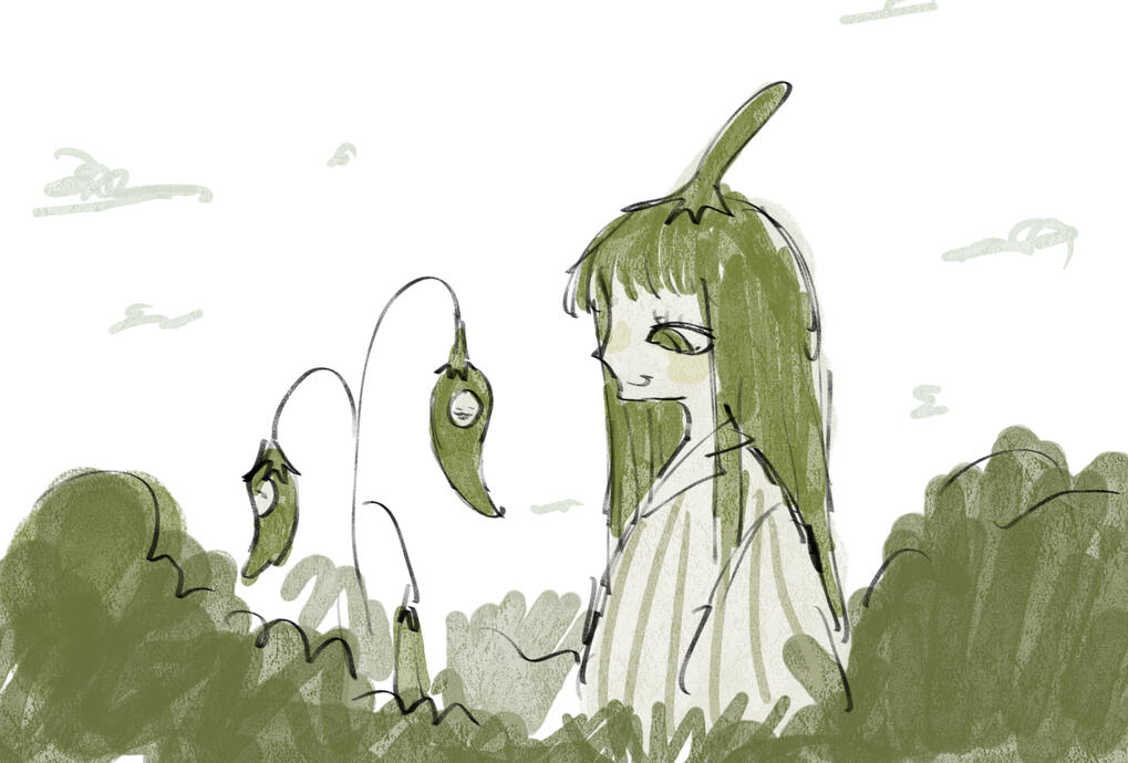 She is a pepper girl who mutated and became humanoid. She often plants other mutant peppers, but she doesn't let them grow like her, so they tend to be small. If they grow too big, she devours them.